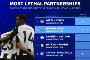 体育资讯4月4日讯 德国转会市场统计了本赛季五大联赛进攻组合连线进球的数量,并列出榜单,维尔茨→希克9球居首。